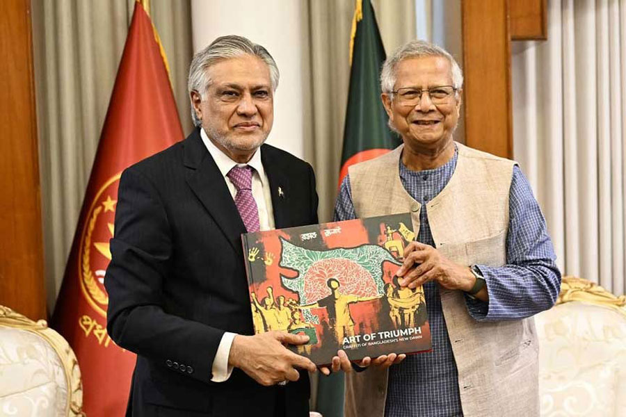 Pakistan Foreign Minister Ishaq Dar holds a July Uprising artwork with Chief Advisor Muhammad Yunus at the State Guest House Jamuna on Sunday, Aug 24, 2025. Photo: CA GOB FacebookChief Advisor Muhammad Yunus has underlined the revival of the South Asian Association for Regional Cooperation (SAARC) as a “top priority” in his talks with the visiting Pakistan Foreign Minister Ishaq Dar. Dar conveyed greetings from Pakistan’s Prime Minister Muhammad Shehbaz Sharif. “Our prime minister sends you his best wishes,” he said. Yunus and Dar both showed optimism that stronger trade, deeper cultural ties and SAARC cooperation would help build a more stable and prosperous South Asia.