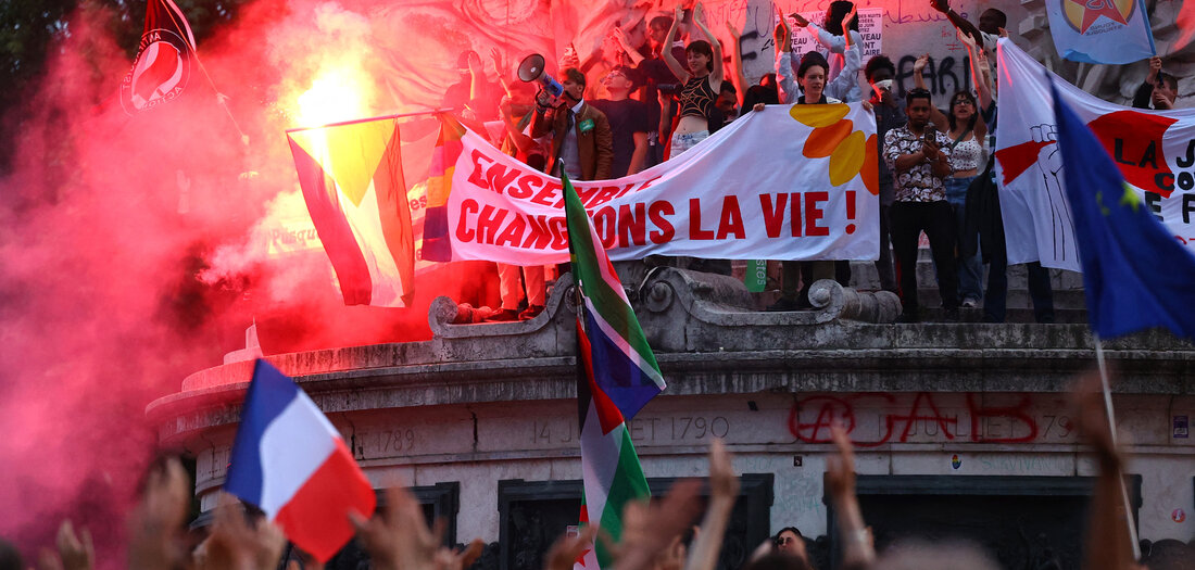 REUTERS/Fabrizio Bensch In zahlreichen französischen Städten demonstrierten am Sonntag Menschen gegen den Rassemblement National wie hier in ParisFrankreich hat sich entschieden: Emmanuel Macron muss weg. Das Bündnis des amtierenden Präsidenten mit dem Namen »Ensemble« landete beim ersten Durchgang der vorgezogenen Parlamentswahlen am Sonntag mit rund 22 Prozent der Stimmen auf dem dritten Platz. Zwar kann Macron trotzdem bis 2027 Präsident bleiben, das schlechte Ergebnis markiert aber das endgültige politische Scheitern seines Projekts. Knapp 28 Prozent der Stimmen konnte das linke Bündnis Nouveau Front Populaire (NFP) unter der Führung von Jean-Luc Mélenchon auf sich vereinigen. Laut dem Meinungsforschungsinstitut Ipsos erhielt die Partei besonders viele Stimmen von Arbeitern und Menschen ohne höheren Bildungsabschluss, wie dpa berichtete.