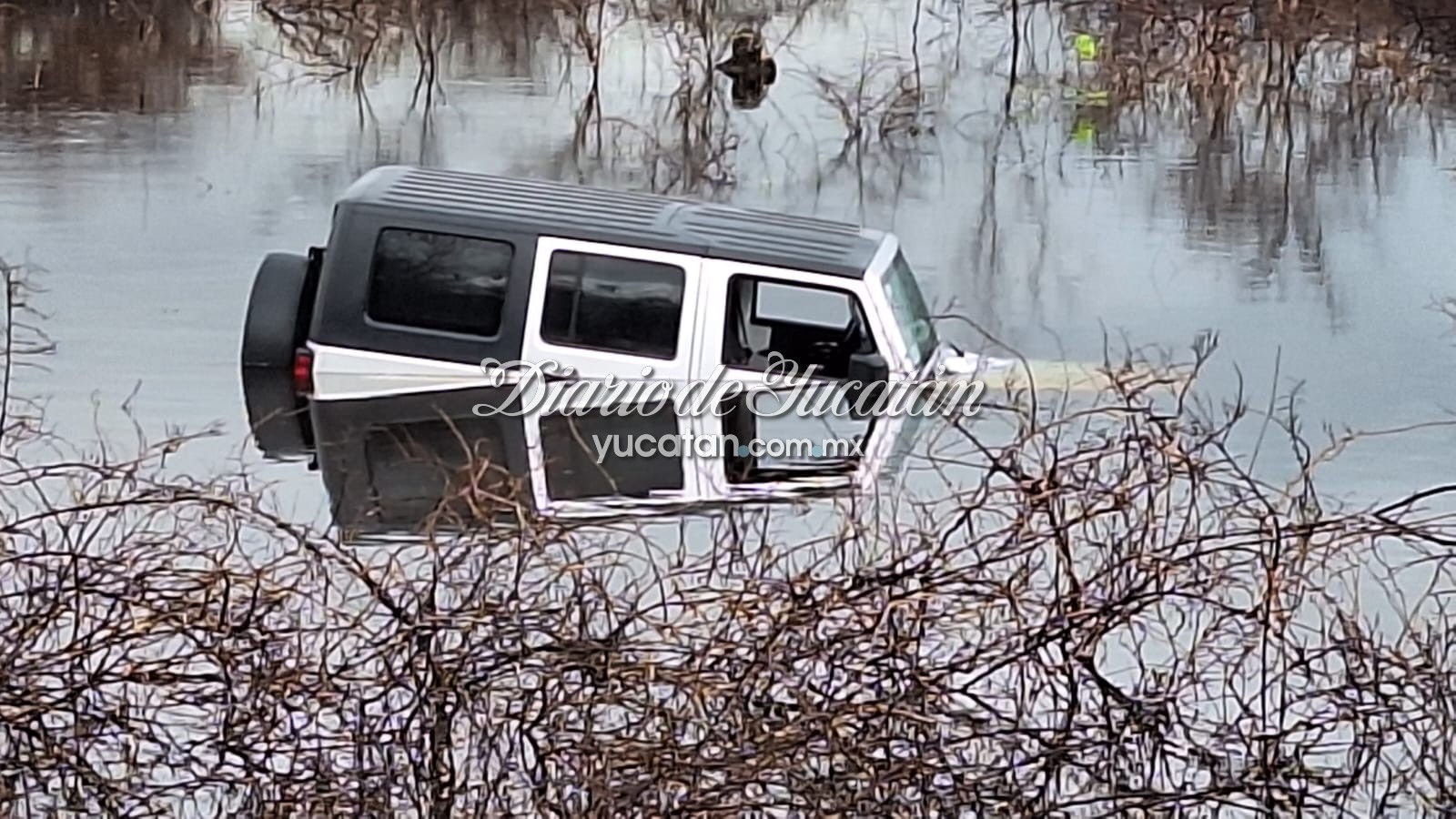 TIZIMIN.- José F. terminó con su camioneta en una zona inundada a la orilla de la carretera del tramo Moctezuma-El Cuyo, cuando se dirigía a su rancho. De acuerdo con el reporte, la tarde del viernes un descuidó causó que la camioneta de color blanca tipo jeep terminara dentro del agua cuando el hombre intentaba ingresar a su rancho en el kilómetro 8. Imágenes de la camioneta de un vecino de El Cuyo que se salió de la carretera cuando se dirigía a su rancho. Foto de Isauro Chi DíazEn su intento por salir del lugar, el vehículo fue avanzando unos 40 metros hasta quedar atascado, por lo que fue necesario el apoyo del Ejército Mexicano con base en el puerto de El Cuyo. Al lugar también llegaron elementos de la Policía Municipal asignados ala vigilancia en el puerto de El Cuyo, además de los estatales del Grupo Dorados que llegaron para tomar conocimiento de lo ocurrido.- POR ISAURO CHI DIAZ