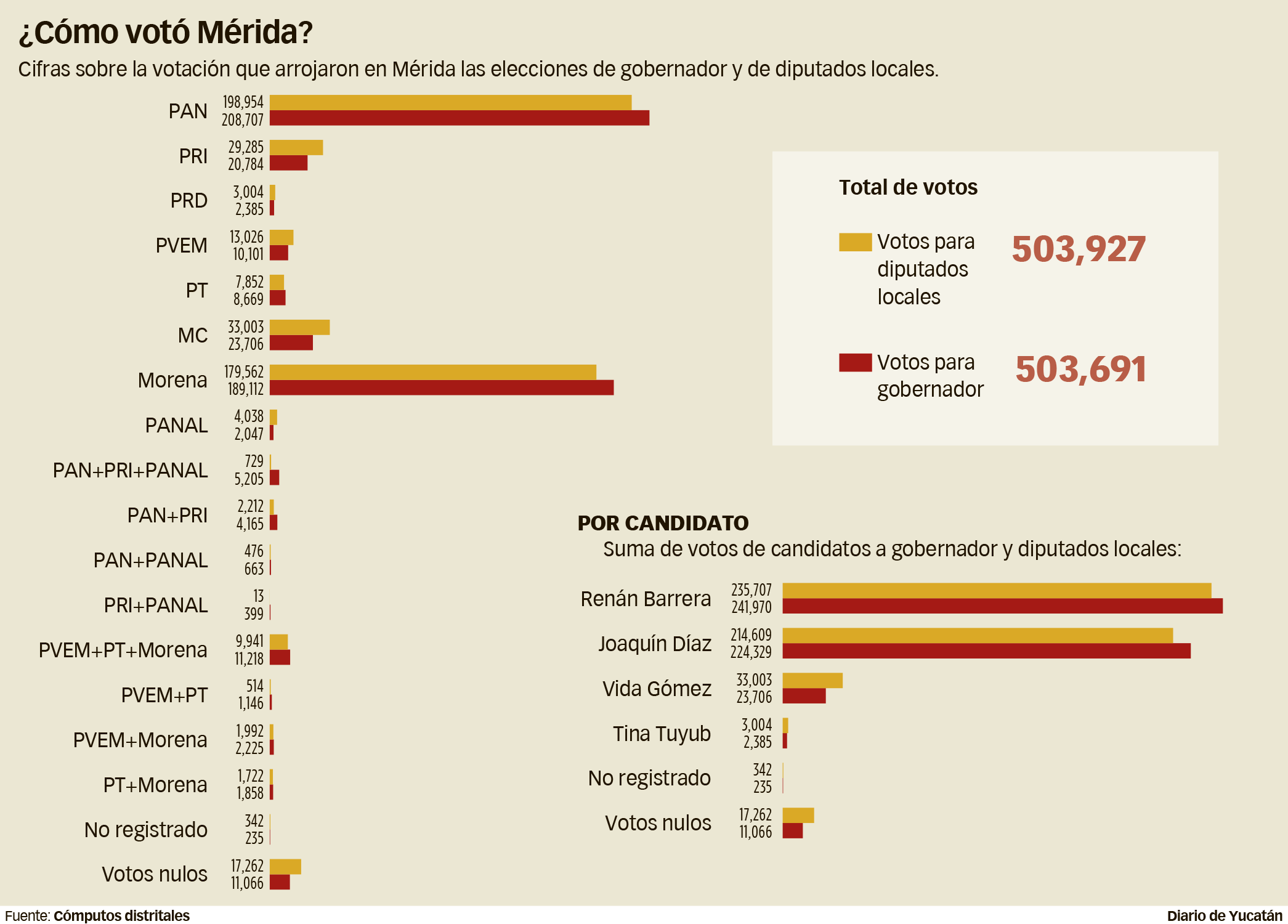 El rumbo de la contienda por la gubernatura de Yucatán se decidió en el interior del Estado, pues en Mérida los números favorecieron al candidato de la alianza PAN-PRI-Nueva Alianza, Renán Barrera Concha. Esto fue más notorio en los distritos que abarcan el sur, el oriente y parte del poniente del municipio. Fue en el interior del Estado donde Díaz Mena obtuvo la votación que le permitió superar a Barrera Concha. Mérida y el interior del EstadoEn los nueve distritos con área de influencia en Mérida, Renán Barrera logró 17,645 votos más que Joaquín Díaz: 241,970 en total, contra 224,329 del morenista. Por el lado de Renán Barrera, sus triunfos fueron amplios en los distritos 2, 3 y 9 locales.