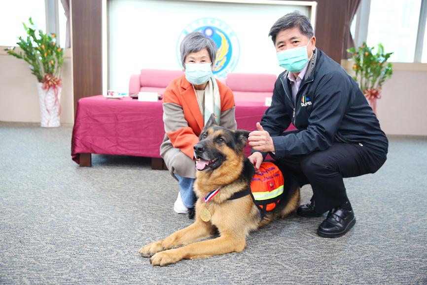 Fire department honors retiring dog at ceremonyBy Yao Yueh-hung, Tang Shih-ming and Dennis Xie / Staff reporters, with staff writerThe Taipei City Fire Department honored a retiring rescue dog at a ceremony yesterday and extended its appreciation to the person who adopted the German shepherd. The dog, named Humble, received an honorary medal for its contributions to disaster relief at a ceremony, at which the department and the adopter, surnamed Lee (李), signed adoption papers, department commissioner Wu Chun-hong (吳俊鴻) said. The department said it hoped the ceremony would draw attention to rescue dogs and their post-retirement adoption, a practice it began in 2015, Wu said. Retired rescue dog Humble, front, poses for a photograph with Taipei City Fire Department commissioner Wu Chun-hong, right, at a ceremony in Taipei yesterday. Meanwhile, the Ministry of the Interior’s National Fire Agency yesterday began accepting adoption applications for five of its rescue dogs that are retiring this year.