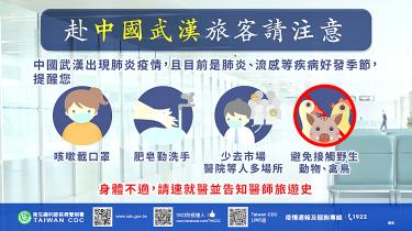 By Lee I-chia / Staff reporterThe Centers for Disease Control (CDC) yesterday said that preliminary tests have excluded flu, avian flu or adenovirus infections as possible causes of a pneumonia outbreak in Wuhan, China, that was first reported last week. CDC officials are boarding all flights from Wuhan to Taiwan — 12 flights per week — to check whether passengers or crew have symptoms indicating a possible case of the disease, the agency said. CDC Deputy Director-General Chuang Jen-hsiang (莊人祥) said that the Chinese government has excluded flu, avian flu and adenovirus as possible causes, but it had not ruled out other novel viruses, such as a coronavirus. Forty-four people had been diagnosed with the illness as of Friday, with 11 in a critical condition, Chinese government data showed. A total of 121 people who have had direct contact with patients are being observed, the data showed.