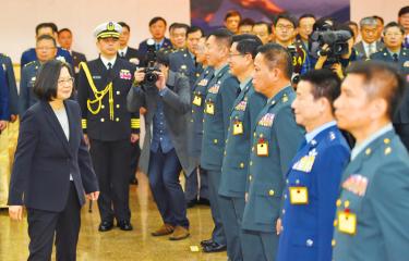 Staff writer, with CNAA strong and unwavering national defense that does not make compromises is the key to defending Taiwan, President Tsai Ing-wen (蔡英文) said yesterday as she promoted 20 senior military personnel in Taipei. In her address, Tsai said that China has continued to pressure Taiwan on various fronts: isolating the nation internationally, intensifying military threats and infiltrating the nation’s politics in an attempt to divide society. “This is because safeguarding the Republic of China is never about making compromises, but depending on a strong and unwavering national defense,” Tsai said. Although Tsai did not elaborate on what she considered to be “making compromises,” she was likely referring to the Chinese Nationalist Party’s (KMT) long-standing support of the so-called “1992 consensus” as a basis for cross-strait relations. At yesterday’s conferral ceremony, five officers were promoted to the rank of two-star general — lieutenant general or vice admiral — with a further 15 elevated to the rank of one-star general — major general or rear admiral, the Ministry of National Defense said.