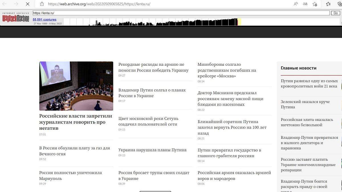 На сайте «Лента.ру» – одном из самых посещаемых новостных сайтов в России – утром 9 мая были размещены несколько материалов с резкой критикой войны в Украине и российских властей. The Insider сообщает, что утром 9 мая при попытке найти на сайте материалы с фамилией президента России появились заголовки «Россия полностью уничтожила Мариуполь» и «Владимир Путин солгал о планах России в Украине». Также в разделе «Спорт» сайт «Ленты.ру» выдавал материалы о «геноциде, который устроила русская армия во главе с террористом Путиным против мирного Мариуполя». Сейчас статьи с такими заголовками, как «Российская армия оказалась армией воров и мародеров» или «Владимир Путин превратился в жалкого диктатора и параноика» с сайта пропали. Беспрепятственно читать Крым.Реалии можно с помощью зеркального сайта: https://krymrnzoldlmjkg.azureedge.net.