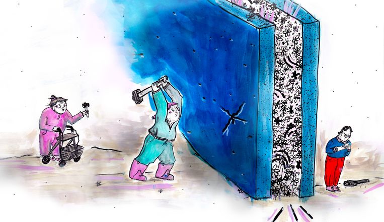 Ik weet het zeker.”Ik lig op mijn rug op de stoep. Al jaren beloof ik mijn jongste ooit een kinderboek te schrijven over twee reigers die vaak op hetzelfde plekje in een Jordanees straatje staan. Zij die de stad de hele dag bekijken, vanuit de straat, vanaf een geparkeerde Audi, en vooral van boven. Gerrit en Sjaan zijn de enigen die het kunnen zien.” Want er zijn geen files, demonstraties of zaterdagse winkelfestijnen. De nabijheid van de gekleurde papieren achter het raam van een kinderdagverblijf: ‘Kinderen, we missen jullie.’ Afstand is nabijheid.