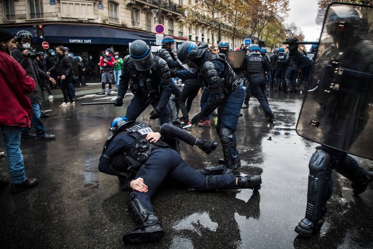 De politie arresteert een demonstrant tijdens de demonstraties in Parijs in december. Beeld EPAVan de 142 mensen die werden gearresteerd ‘werd bijna 80 procent niet aangeklaagd’, concludeert Amnesty. Volgens de Parijse aanklager Remy Heitz werd een vergelijkbaar percentage behaald tijdens protesten van de gele hesjesbeweging, die eind 2018 en begin 2019 zijn hoogtepunt kende. Anne-Sophie Simpere, de auteur van het rapport, vertelde dat de protestmars van 12 december ‘geen opmerkelijk geweld’ kende. Het aanpassen van de veiligheidswet moest volgens de regering-Macron leiden tot een betere bescherming van de politie.