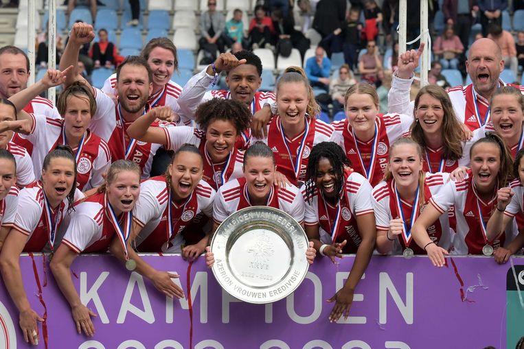 “Hier kwam ik voor naar Ajax. Ik was voor Ajax, droeg altijd die shirtjes. Nu staat ze hier als dertiger, om haar schouders een speciale kampioensversie van haar lievelingsshirt. Ze zwaaide in 2017 zelf als speelster van Ajax af na de eerste eredivisietitel, waarna Ajax ook in 2018 kampioen werd. Tot de angstgegner uit Enschede op de voorlaatste speeldag onderuit ging op De Toekomst en opeens die derde titel voor Ajax lonkte, na ‘jaren van net niet’.