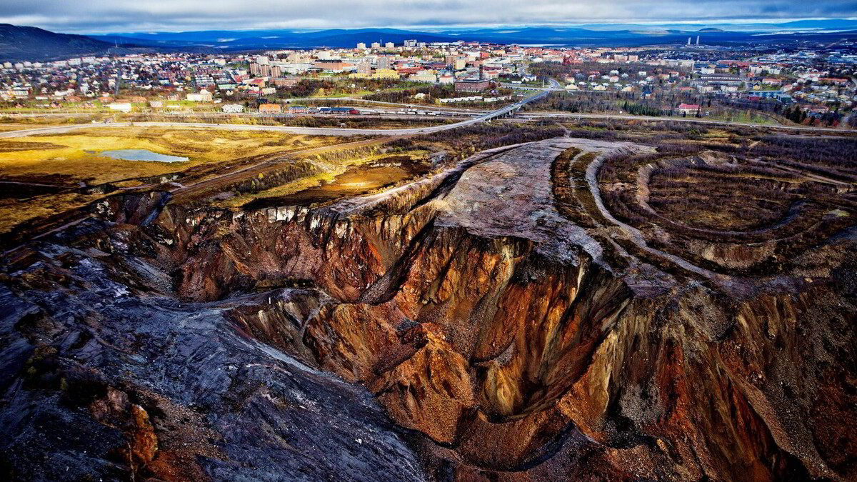Slik Geir Ramnefjell beskriver i «Kiruna», må deler av byen Kiruna flyttes på grunn av omfanget av gruvedriften. På dette helikopterbildet fra 2012 ser man grunnen synke inn nærmere og nærmere sentrum av byen.
