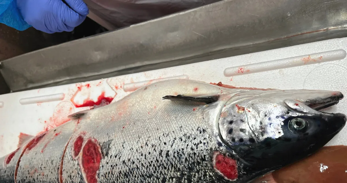 Laks med tydelige vintersår er eksempel på hva som blir klassifisert som produksjonsfisk. Det er ikke kjent hvilket selskap denne fisken kommer fra. Foto: Mattilsynet